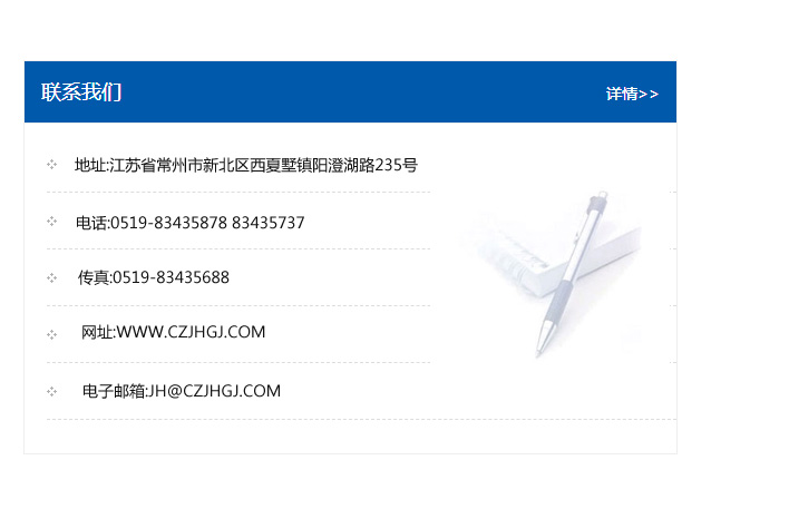 地址:常州市新北區友邦商務大廈1幢16、17層  電話:0519-85101652  傳真:0519-85112595  郵編:213022  網址:www.cz-jiayue_cn.zhihengkj.com  郵箱:xiajifengaa@163.com